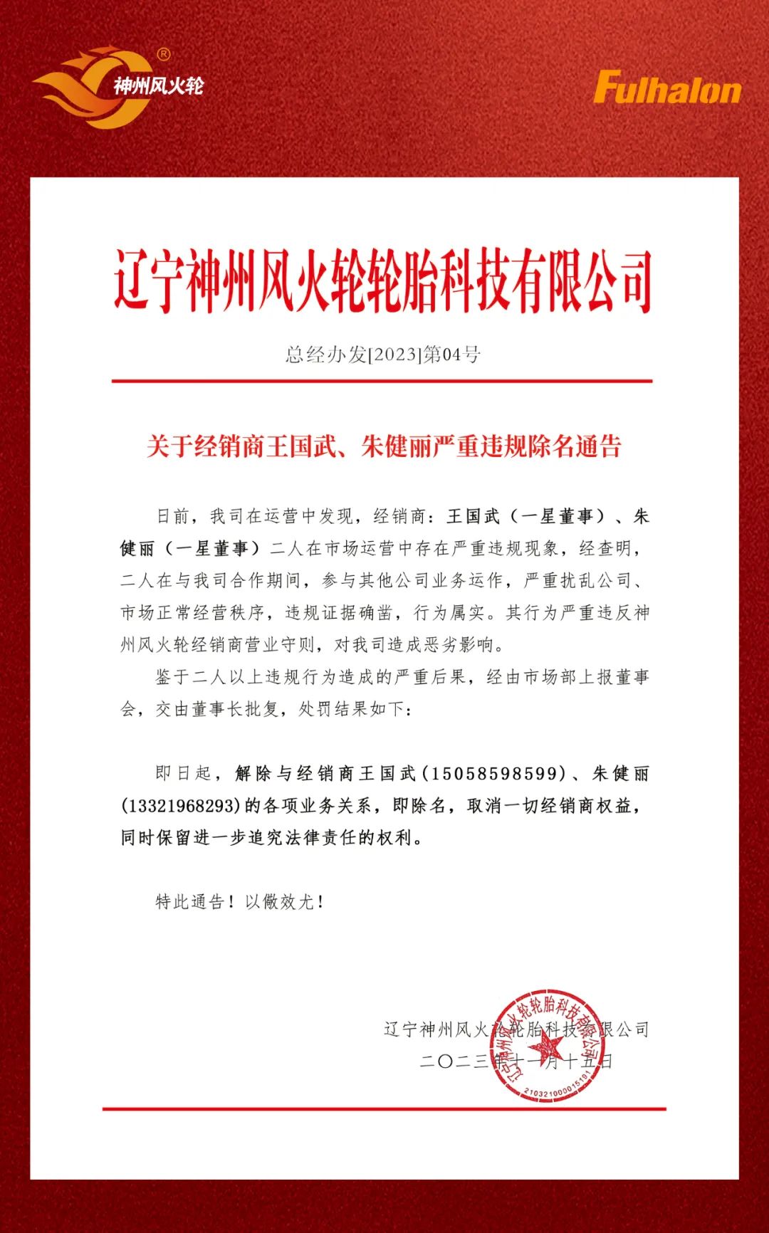 關(guān)于神州風(fēng)火輪經(jīng)銷(xiāo)商嚴(yán)重違規(guī)違紀(jì)的處理通告!